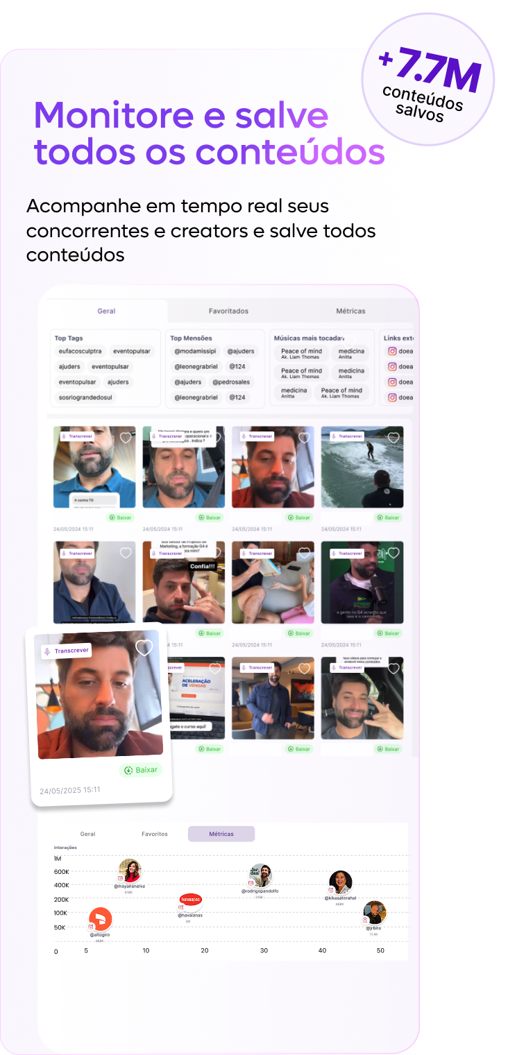 - + 1.5 Milhões de posts salvos e transcritos